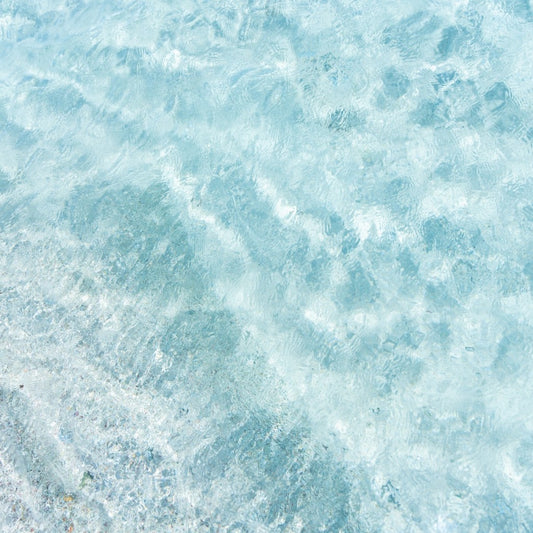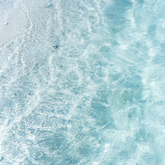 • Fine art photography featuring a gentle wave lapping across a pink sand beach. The water is clear and small salty bubbles are visible across the sand, creating an organic design.